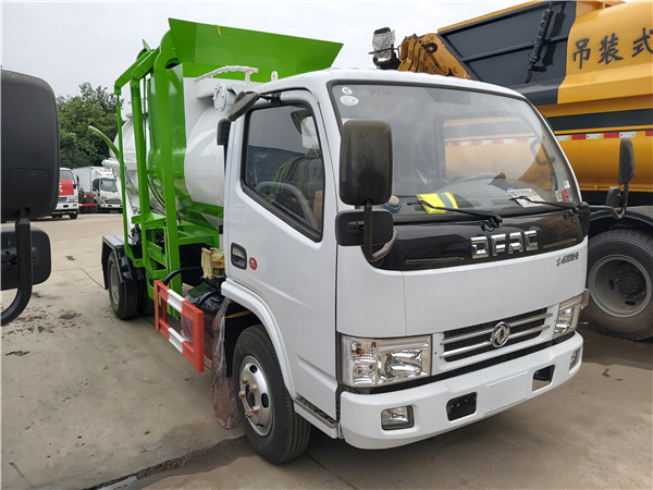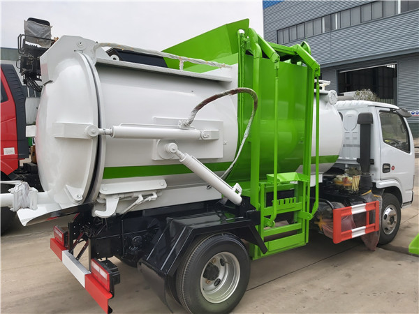 廚余壓縮垃圾車:帶壓縮功能,后面帶翻轉(zhuǎn)機(jī)構(gòu)。將垃圾桶掛在車廂尾部,翻轉(zhuǎn)機(jī)構(gòu)將垃圾桶內(nèi)的垃圾倒入車廂斗內(nèi)。刮板將垃圾向車廂前部推并壓縮,可將垃圾壓縮成塊。廚余垃圾車的裝載量較多